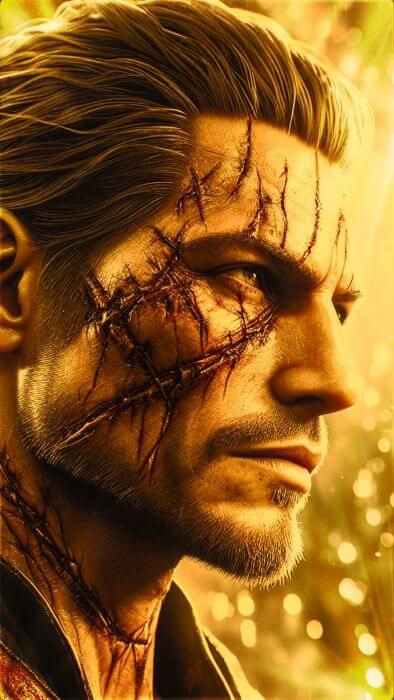 Scarring: None visible, but sometimes symbolic (a faint scalp scar, a recurring tremor).