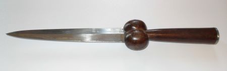 Daggers, being double-edged stabbing weapons, were more closely tied to knights and the nobility because the cruciform shape of the weapon matched the shape and style of most arming swords of the period. The earliest depiction of the cross-hilted dagger is from 1120 AD in the “Guido relief” inside the Grossmünster of Zürich. [1] However, as the Middle Ages progressed other versions of the dagger were developed by the lower classes such as the bollock dagger, the ancestor of the Scottish dirk.