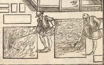A 1594 woodcut depicting English gardeners. They are wearing cotehardies reminiscent of the 15th century as well as hose and low shoes. Photo source.