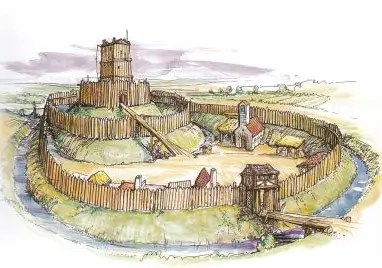 The first type of castle is a motte-and-bailey castle. A motte is an earthen mound, usually flattened at the top. It could be natural or manmade. [5] They ranged in height from 10 to 100 feet (3-30 m) and in diameter from 100 to 300 feet (30-90 m) [6] On top of the motte, was built a keep, which housed the lord, his family, and household. The early keeps were constructed of wood, which made them susceptible to fire. Over time, stone became the more common building material. The motte and keep were surrounded by a wall or palisade that enclosed the bailey. It was an open space that keep attackers at a distance and housed various buildings such as the stables, forge, workshops, storehouses, barracks, and kitchen. [7] Motte-and-bailey castles were first built in northern Europe in the 10th century, spreading to southern Europe throughout the following century. The Normans introduced them to England when they invaded, and they were adopted through Britain and Ireland during the 12th and 13th centuries. The design was surpassed by others by the end of the 13th century.