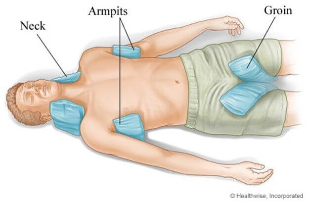 Immediate cooling. Ice water immersion or ice packs to major arteries.