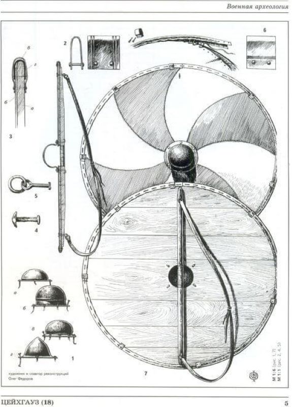 Straps – For shields that were strapped to the arm, there was a leather strap that the user slipped their arm through and a handle that they gripped with their hand. The handle could be made from either leather, wood, or metal. There was a variation of this set up that used a belt known as a guige. The guige looped around the neck or shoulders, helping to support the weight. It also allowed the shield to be carried on the back or dropped and retrieved later. [1]